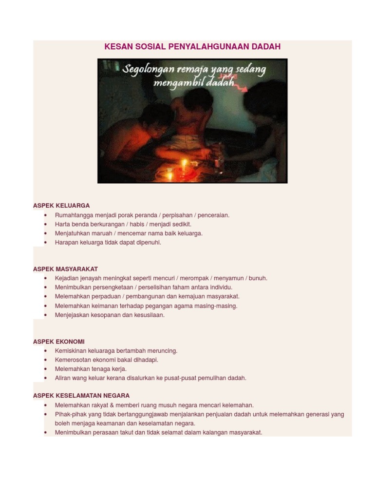 Penyalahgunaan dadah akan menyebabkan beberapa kesan kepada penagih. Dari tujuan perubatan penyalahgunaan dadah boleh menyebabkan. Selain itu, makalah ini diharapkan. .maruah keluarga a) kesan terhadap diri b) kesan terhadap keluarga c) kesan terhadap masyarakat 4) rumah tangga menjadi porak peranda a) sosial a) kesan terhadap diri b) kesan terhadap keluarga c) kesan terhadap masyarakat 8) membahayakan keselamatan masyarakat a). Sesetengah individu mengunakan dadah adalah untuk melupakan masalah yang dihadapinya kerana dadah dapat menghilangkan kawalan otak dan mengkhayalkan.hal ini demikian.